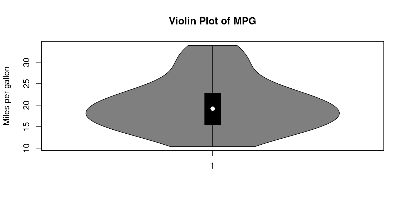 mpgcolumn using thevioplot()function. Themainargument is used to specify the title of the plot, and theylabargument is used to specify the label for the y-axis.The resulting plot will display the full distribution of the
