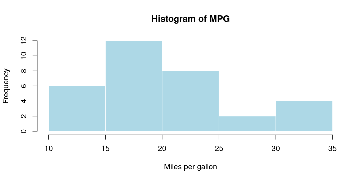mpgvalues in the dataset, with the bars representing the number of observations falling within a specific range of values.